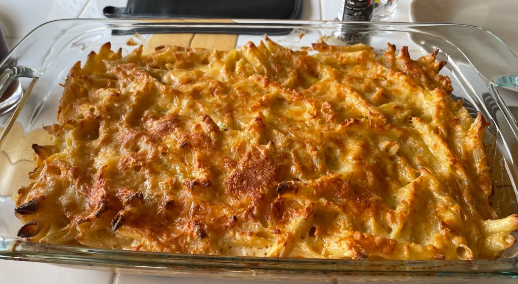 - Pour pasta mixture into a 15”x10”x2” rectangular baking dish, sprinkle remaining cup of Parmesan and Gouda cheese on top layer. Place pan on the middle rack in oven uncovered and bake for 45 minutes to 1 hour or until top is golden brown. Let sit for 10 minutes before serving.