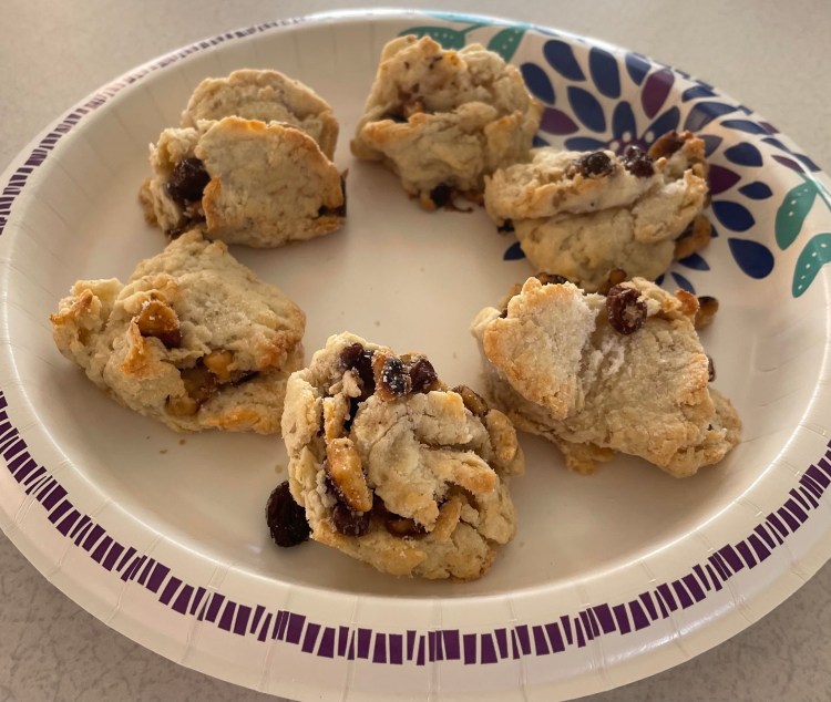 - Stick one side on the sugar and put the raisins and walnuts on the sugar side.