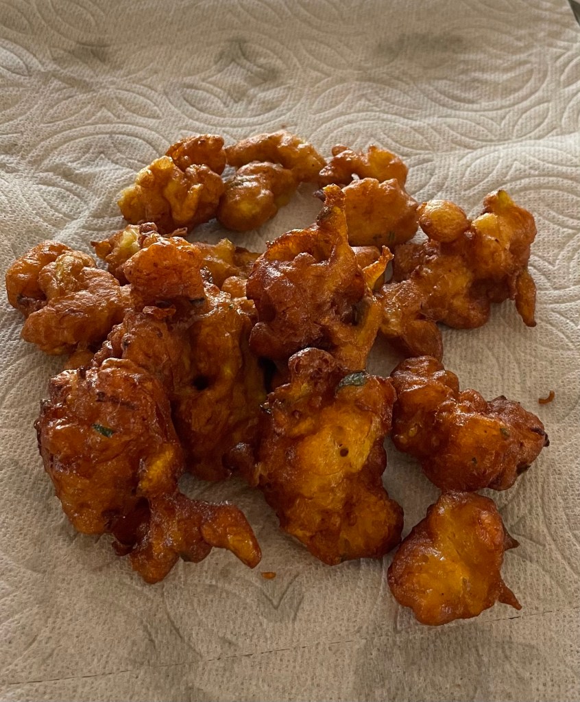 - Remove the cooked fritters from the oil with a slotted spoon, and place on a paper-towel-lined tray to drain.