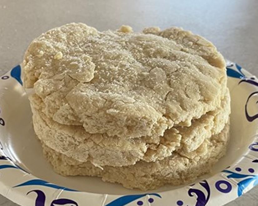 - Press down on a well-greased sheet until it is about ½” thick. Sprinkle sugar over each flattened dough.