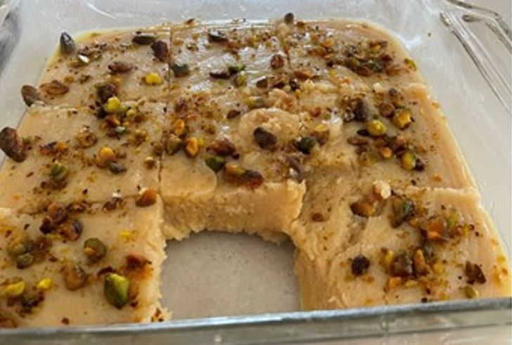 - Grease a tray with ghee and pour the mixture into it. Garnish with chopped pistachios.