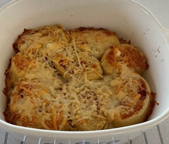 - Brush the sides with olive oil so they don’t stick to each other and then place, cut side up in the casserole. Top with ½-1 tsp grated Parmesan per spiral and bake at 325F for 45-50 minutes (the less Parmesan you add to the spirals, the easier it will be to see their lovey design).
