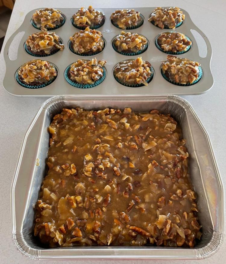 - Once cool, prepare Coconut Pecan frosting. Pour over one layer, but not sides. If doing double layer cake, pour over each layer. This makes a lot of topping. You don’t have to use it all. You can save and freeze for cupcakes or another recipe.