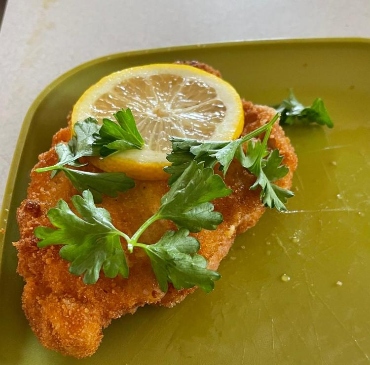 - Make sure the cooking oil is hot enough at this point (about 330F) as you don’t want the Schnitzel to sit around in the coating before frying. Use enough oil so that the Schnitzels “swim” in it.