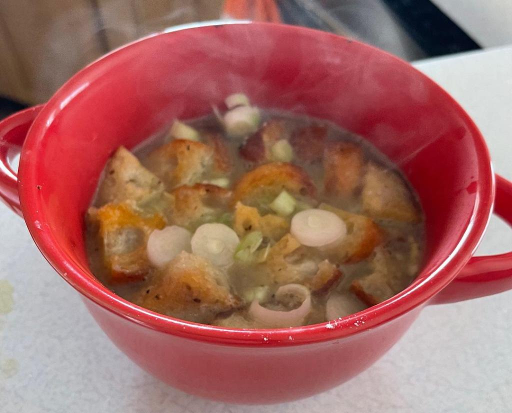 - Pour the soup over top of the bread cubes.