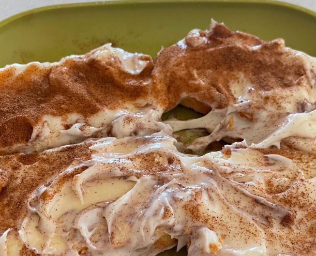 - Pour the pudding mix over the cake and then sprinkle cinnamon on top.