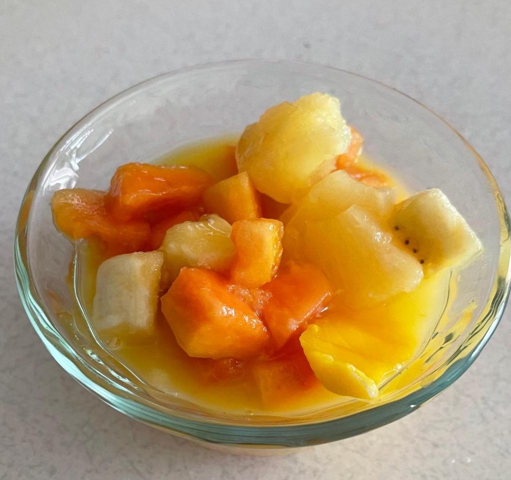 - Add all of the diced fruit into a large bowl and pour over the orange juice. Set aside.
