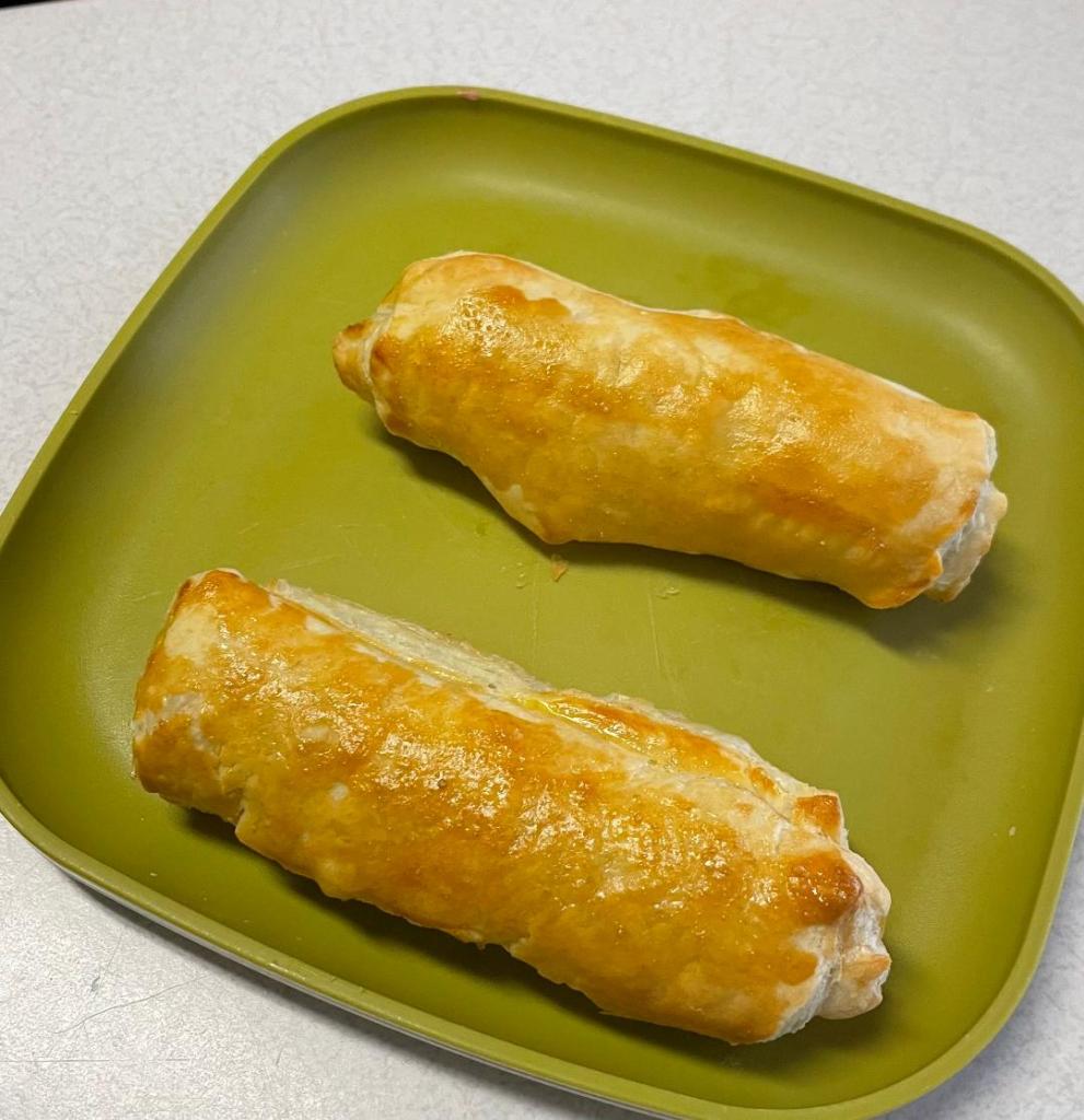 - Using premade (shop bought, pre-rolled for total ease) puff pastry place about 2-3 TBSP of the cold mix in a sausage shape down one side of a 4×4-inch square of pastry, roll up into a sausage shape (stick the edge with some beaten egg mix if you need to).