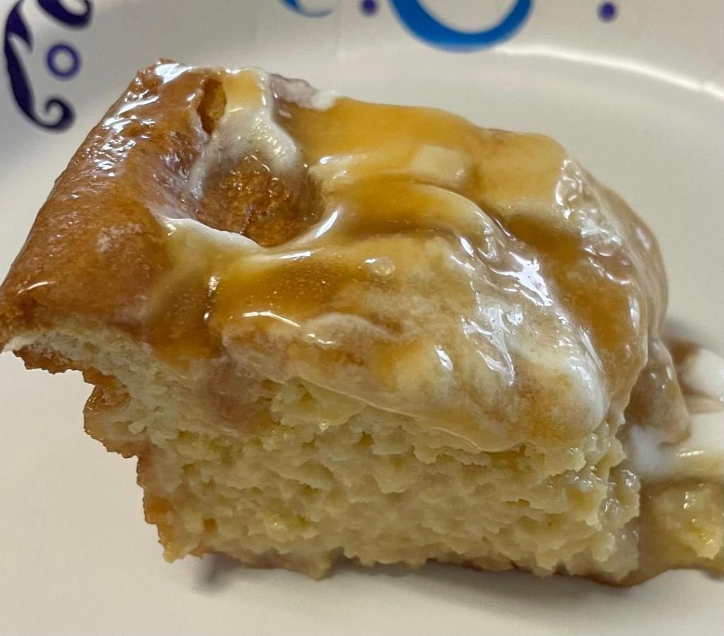 - Once cooled for 15 minutes, pierce all over with a fork. In a large cup combine double cream, evaporated milk and condensed milk and drizzle over the top of the cake. Leave to soak for 30 minutes.