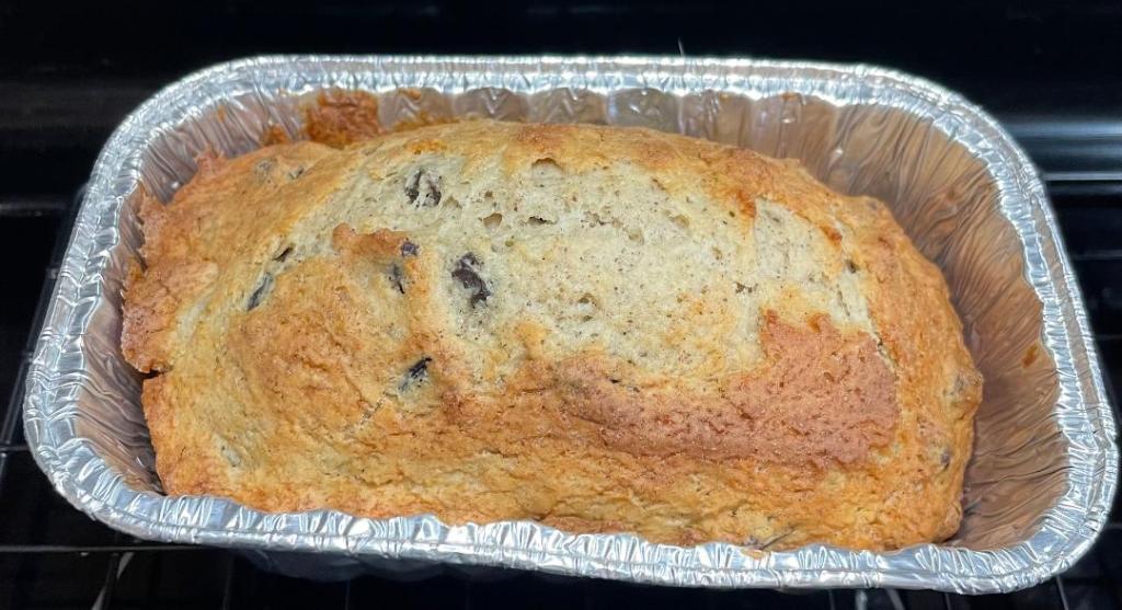 - Pour batter into greased loaf pan and bake in oven for about 45 min – 1 hour.