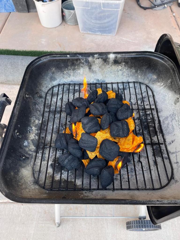 I had heard that putting Dorito chips as the starter worked well, so I had to try it. It really WAS a great way to start the charcoals!! Highly recommend also!