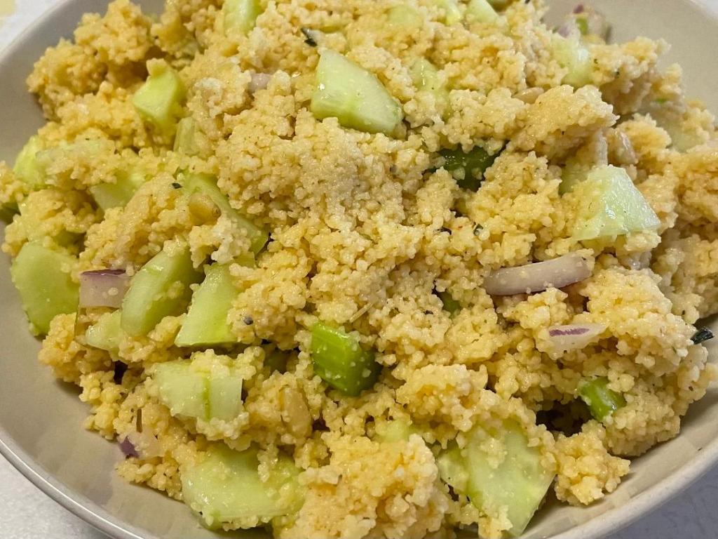 - Spoon in couscous into a large bowl.