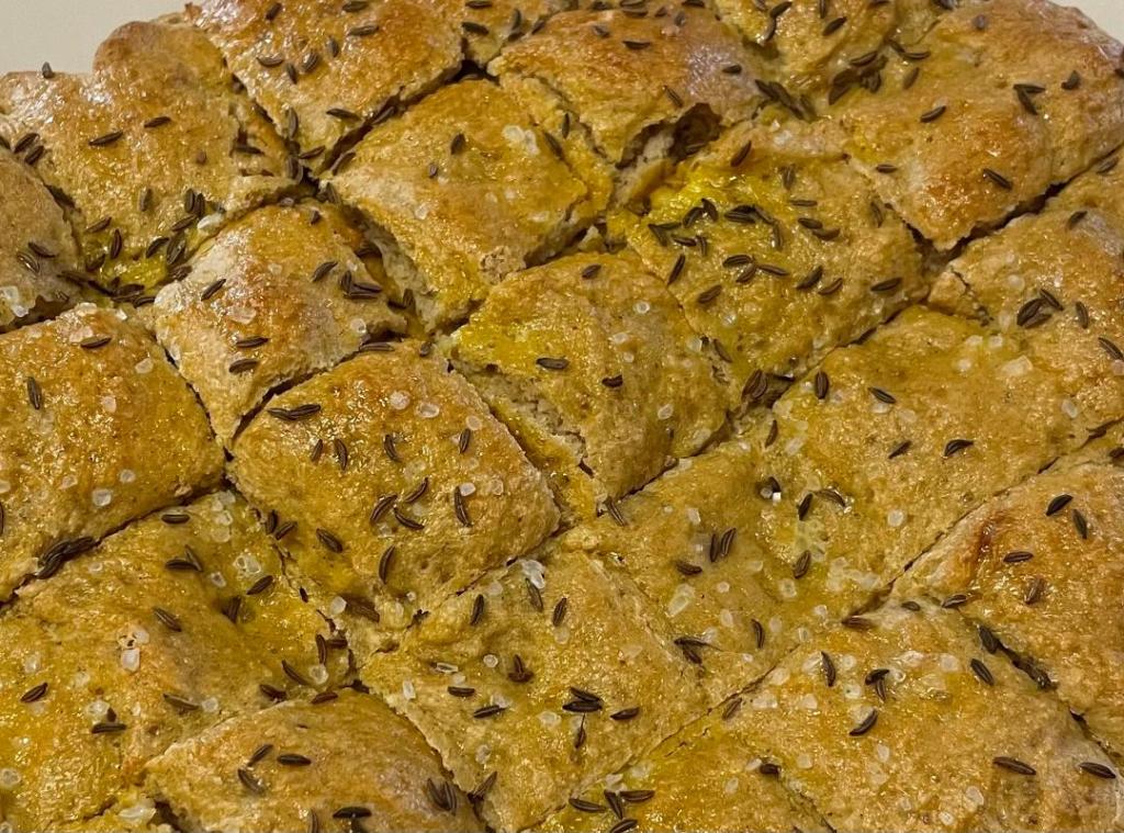 - Brush the dough with an egg wash and sprinkle with coarse sea salt and caraway seeds.