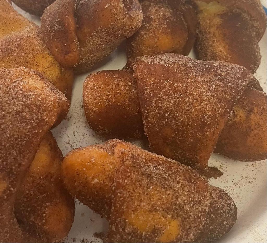- Next, roll the Xuixos in sugar and cinnamon, and they are ready to be eaten!!