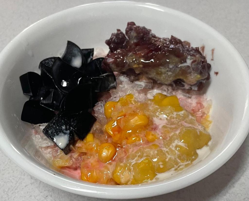 - Transfer the shaved ice to a bowl and add 2 TBSP syrup, followed by all the ingredients for the toppings.