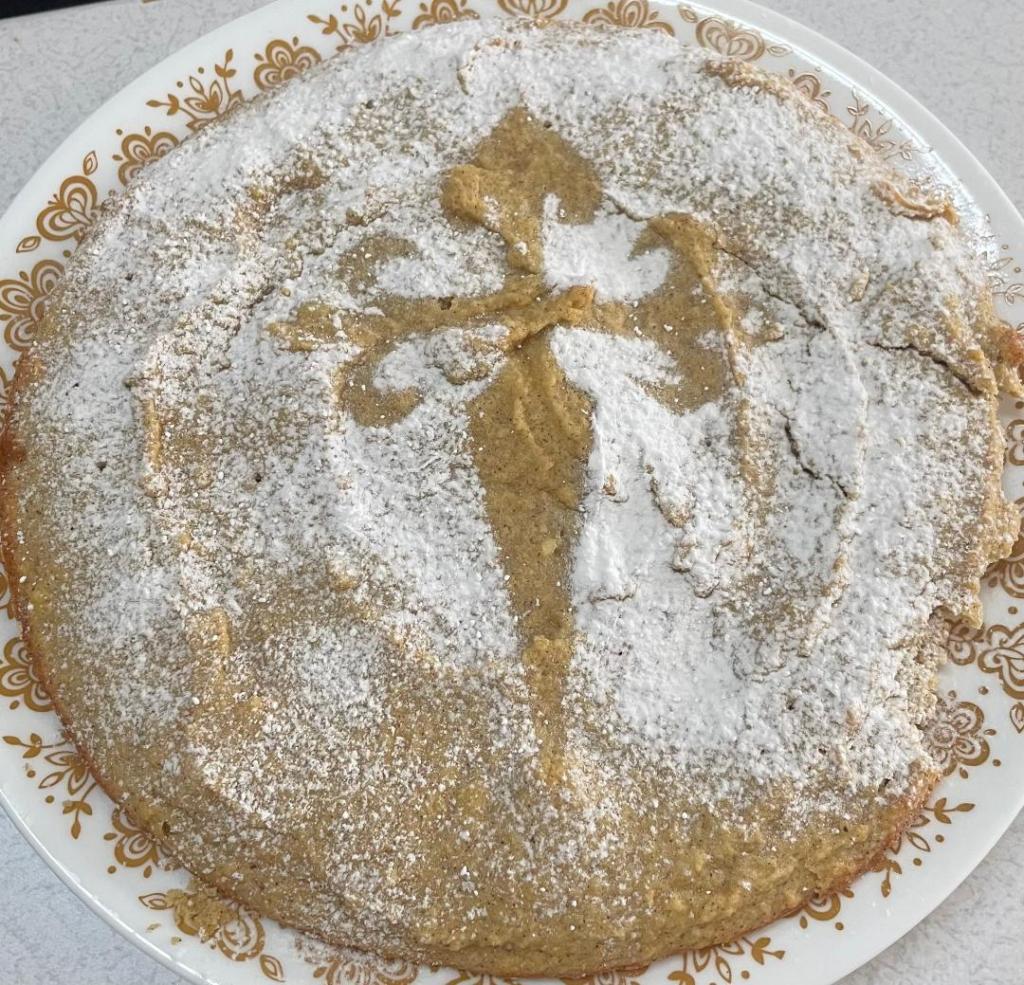 - To decorate the cake traditionally, cut the cross of Santiago on cardboard and place it on the cake.
