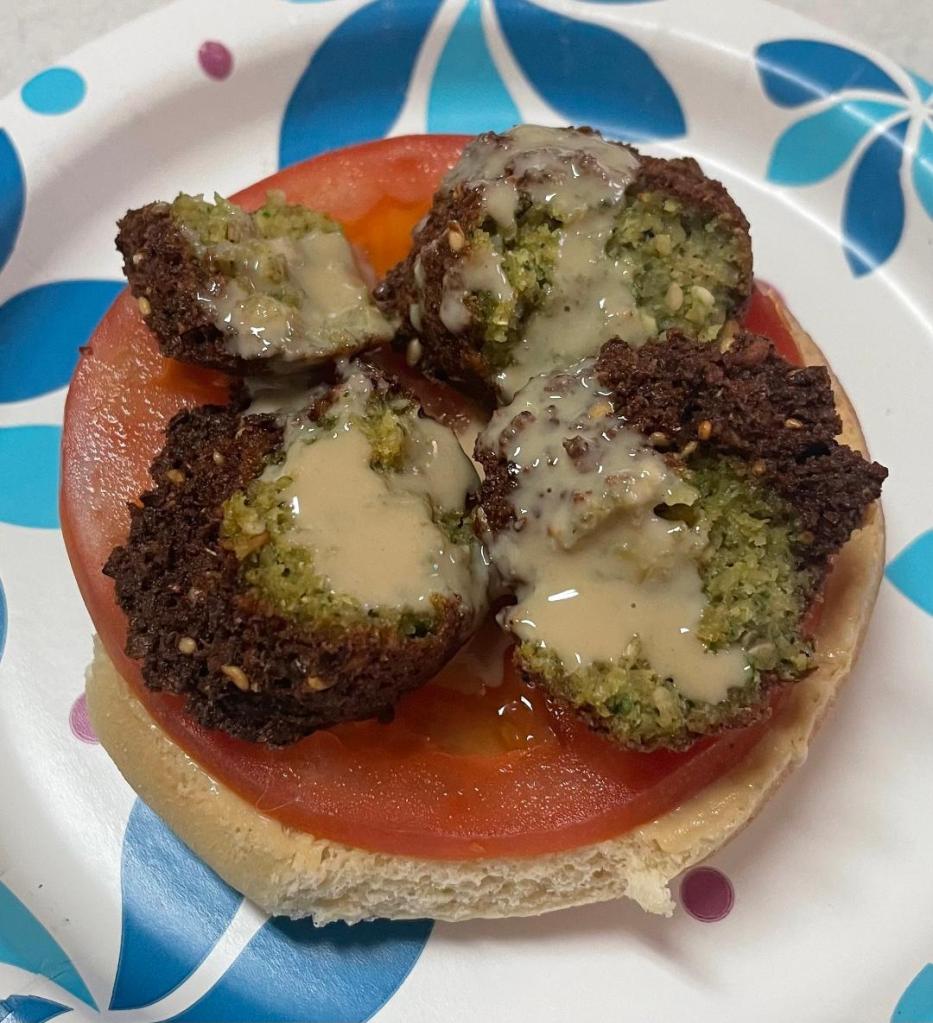 I made a Keto Hamburger Bun Sandwich. I put hummus on the bun, then a slice of tomato, then the falafel drizzled with tahini sauce. It was yummy!!!
