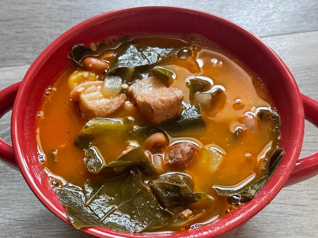 - Add the meat back to the pot, stir it again and add the fava beans, yuca, and greens (if the greens are too bulky, add about half the greens at first, then let them cook for 10 minutes and then add the rest).