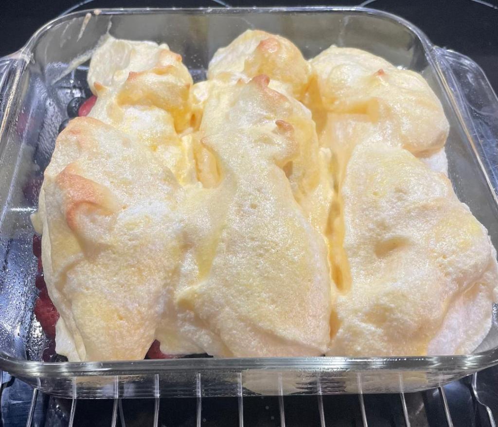 - Bake in the oven for about 7-8 minutes or until the peaks are turning to a light golden-brown color.